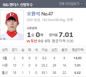 있는 상황이다. 이번 경기에서 오원석이 선발 등판할 예정이며 올 시즌 1승 25이닝 29삼진 평균자책