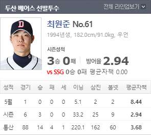 끊어냈다. 이번 경기에서 최원준이 선발 등판할 예정이며 올 시즌 3승 33이닝 25삼진 평균자책