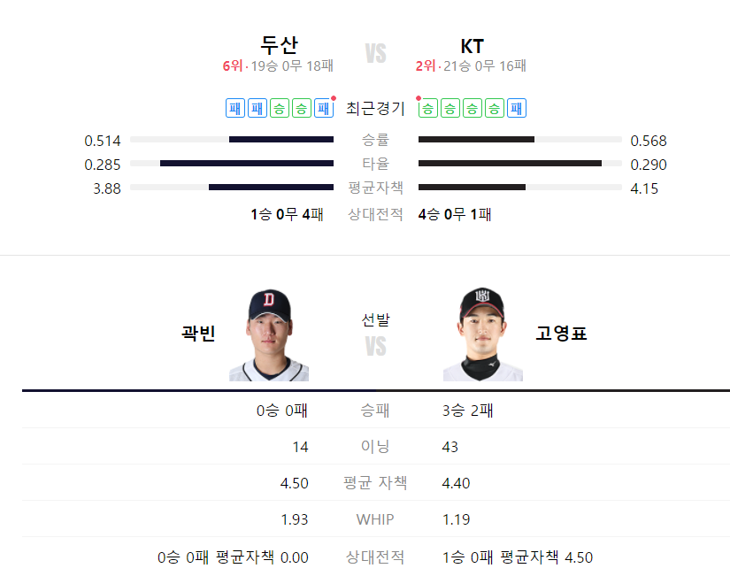 직전 경기에서 승리하며 4연승을 기록한 KT는 이번경기 선발로 고영표 선수가 등판한다.
