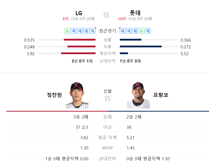 직전 경기에서도 패하며 3연패의 부진에 빠진 롯데는 이번경기 선발로 프랑코 선수가 등
