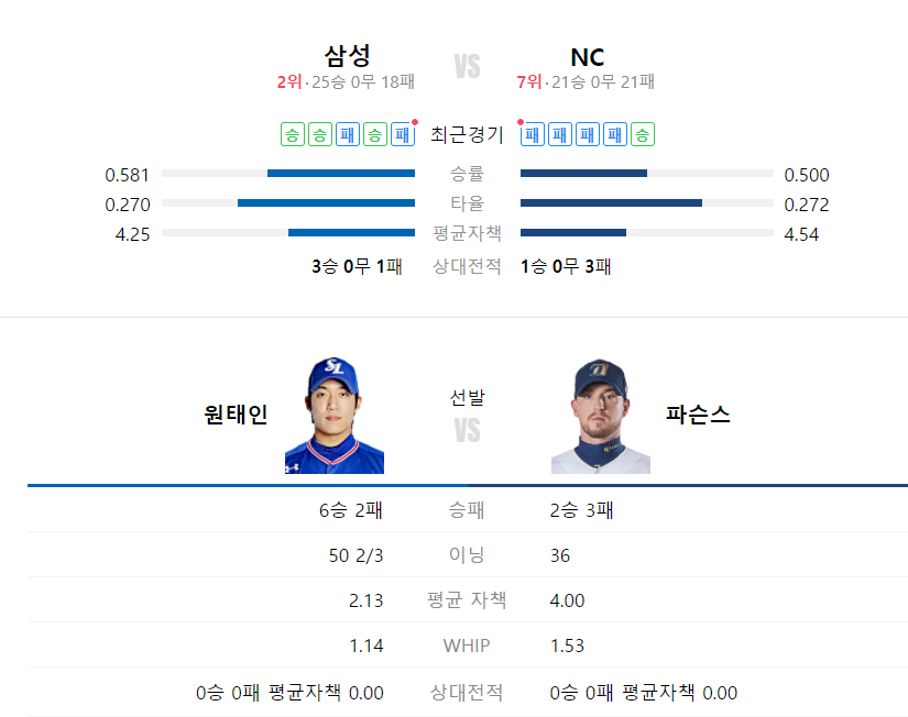 직전 경기에서 승리하며 연승을 기록한 삼성은 이번경기 선발로 원태인 선수가 등판