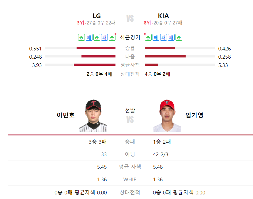 직전 경기에서 승리를 거두며 그 이전 패배를 만회한 LG는 이번경기 선발로 이민호