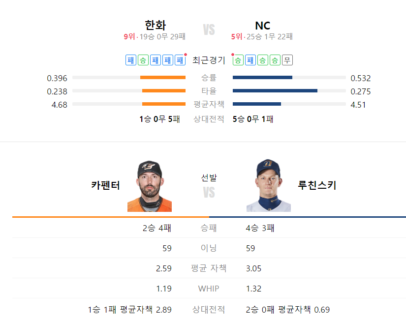 를 기록하는 다소 좋은 성적을 보이고 있다. 이번경기 선발로 나서는 루친스크 선수는
