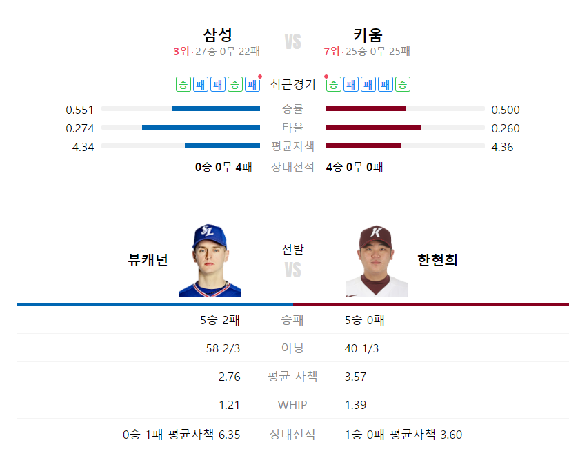 직전 경기에서 승리하며 연패의 부진에서 벗어난 삼성은 이번경기 선발로 뷰캐넌 선수