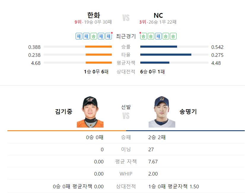 직전 경기에서 승리하며 연승을 기록한 NC는 이번경기 선발로 송명기 선수가 등판한