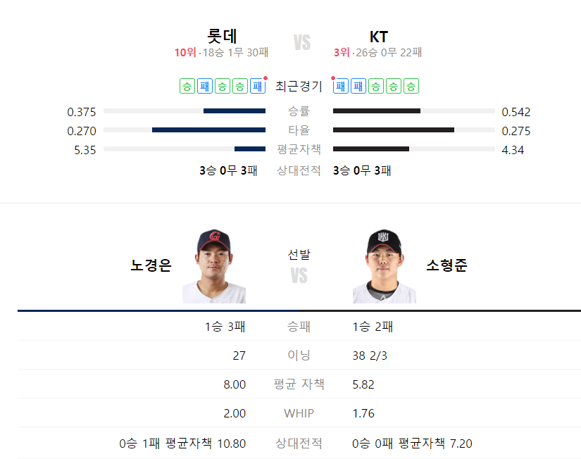 직전 경기에서 패하며 연패를 기록하고 있는 KT는 이번경기 선발로 소형준 선수가 등판