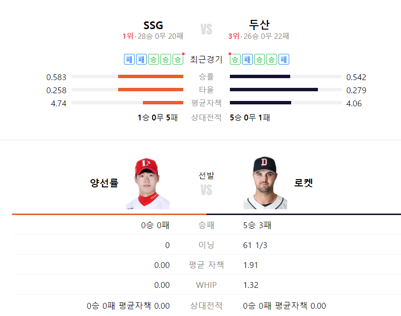 직전 경기에서 패배로 연패의 부진에 빠진 SSG는 이번경기 선발로 양선률 선수가 등판