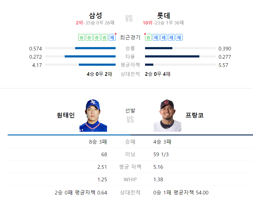직전 경기에서 패하며 4연승에서 아쉽게 연승을 마감한 삼성은 이번경기 선발로 원태인