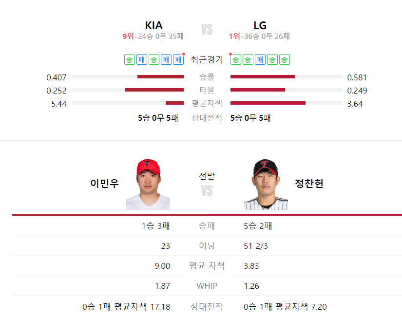 직전 경기에서 승리하며 연승을 기록한 LG는 최근 5경기에서 4승1패의 전적을 기록하