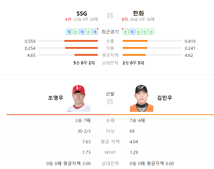 직전 경기에서 승리하며 연승을 기록한 SSG는 이번경기 선발로 조영우 선수가 등판한