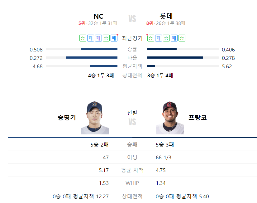 한 성적을 보이고 있고 이번경기 상대 롯데 타선을 상대로도 2경기 등판해 7.1이닝 10실점
