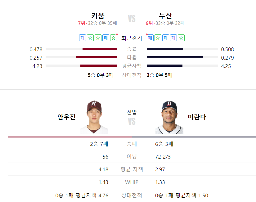 두산 키움 야구분석