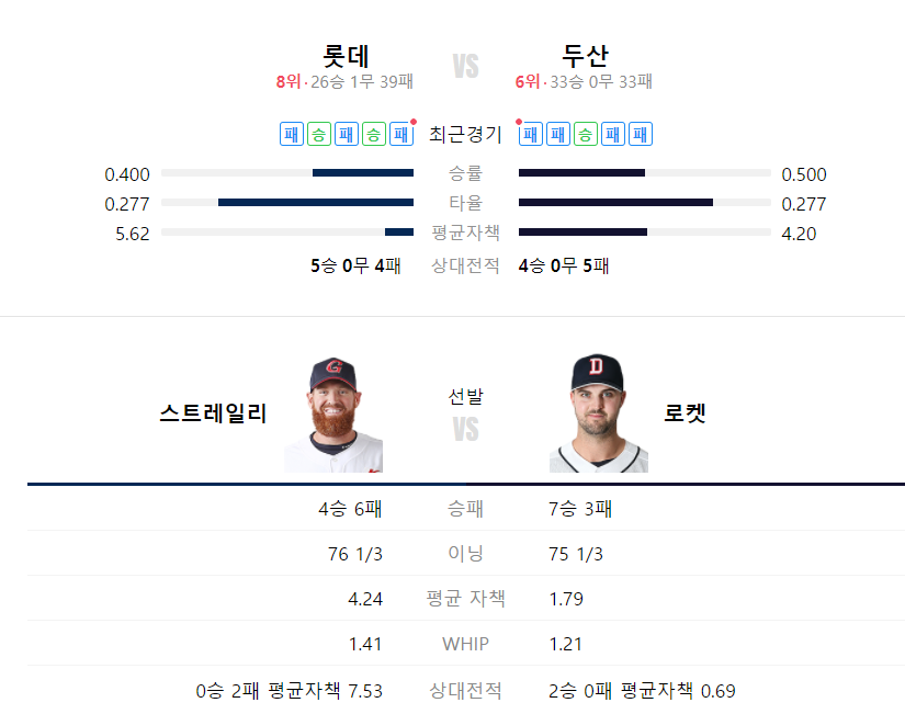 직전 경기에서 패하며 연패를 기록중인 두산은 이번경기 선발로 워커 로켓 선수가 등판한