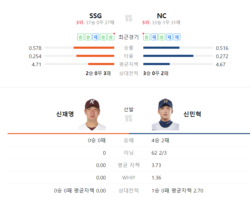 직전 경기에서 승리를 거두며 연승을 기록중인 SSG는 이번경기 선발로 신재영 선수가 등