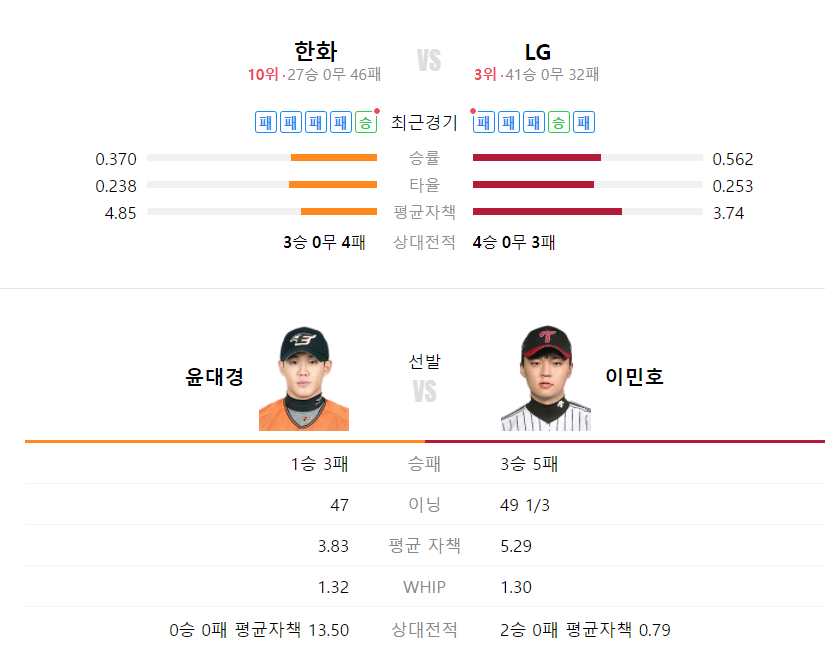 우천으로 직전 경기가 최소된 LG는 최근 3연패의 부진을 기록하고 있다. 이번 선발로 나서는