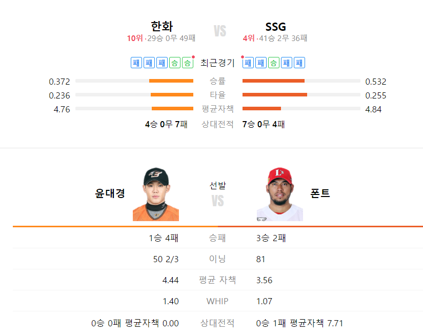 SSG 한화 야구분석
