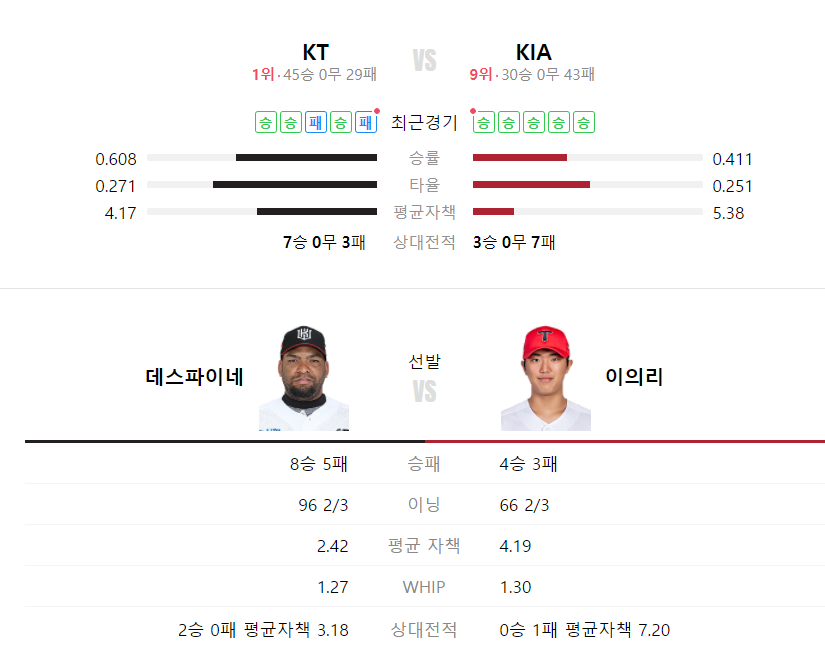 직전 KT전에서 승리하며 5연승을 달리고 있는 KIA는 이번경기 선발로 이의리 선수가