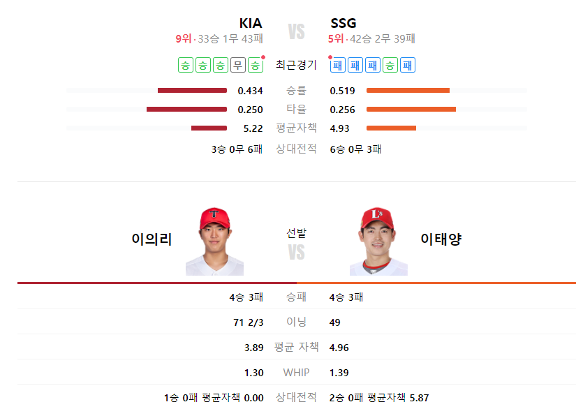 직전 KIA전에서도 패하며 3연패의 부진에 빠진 SSG는 이번경기 선발로 이태양 선수가