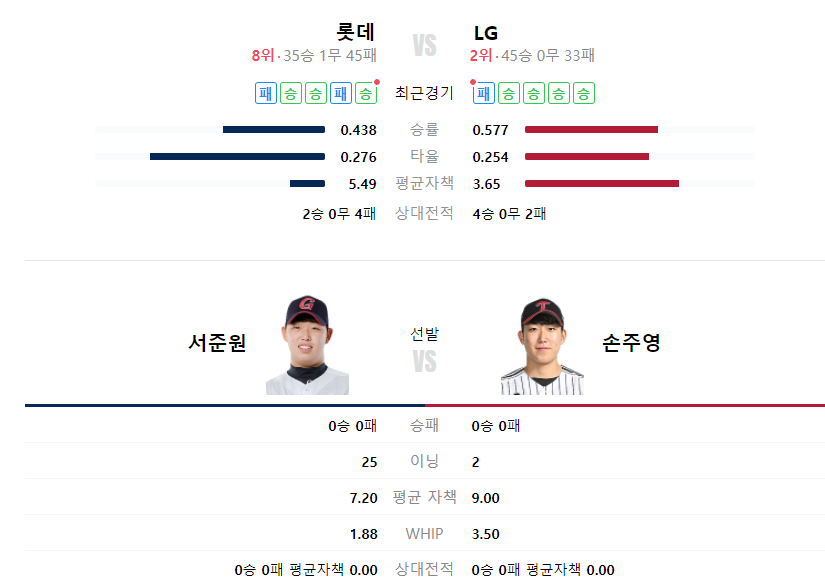직전 롯데전에서 패하며 연승을 마감한 LG는 이번경기 선발로 손주영 선수가 등판한다.
