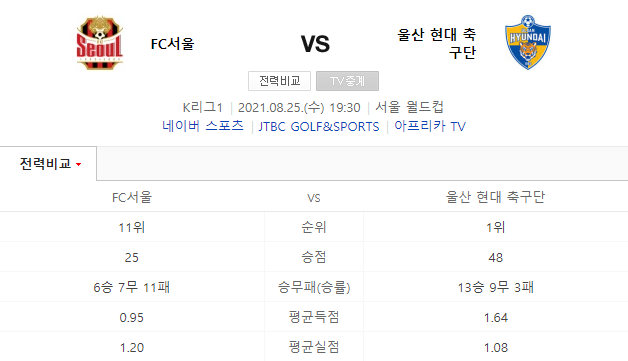[킹콩티비] FC서울 울산현대 분석 8월25일 K리그 스포츠중계