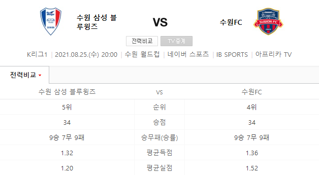 [킹콩티비] 수원삼성 수원FC 분석 8월25일 K리그 스포츠중계
