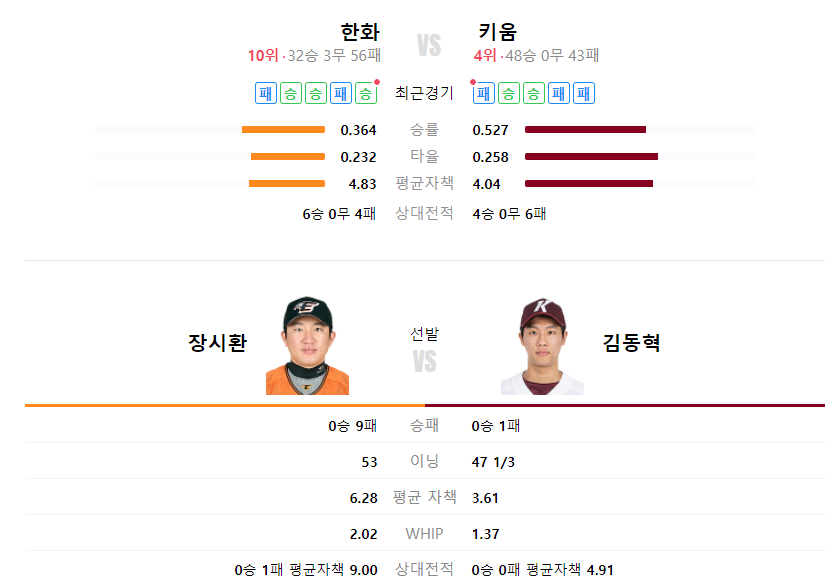 직전 키움전에서 승리하며 이전 패배를 만회한 한화는 이번경기 선발로 장시환 선수가