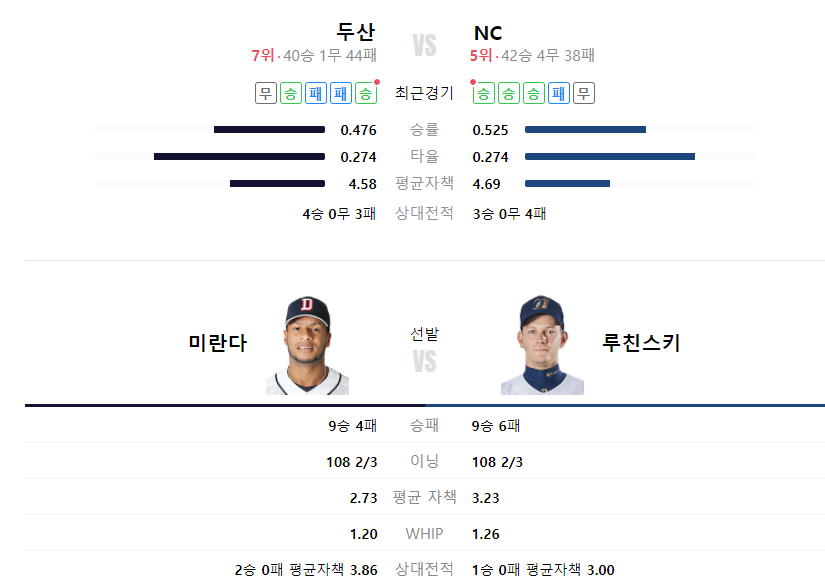직전 경기가 우천으로 취소된 두산은 이번경기 선발로 미란다 선수가 등판한다. 이번시