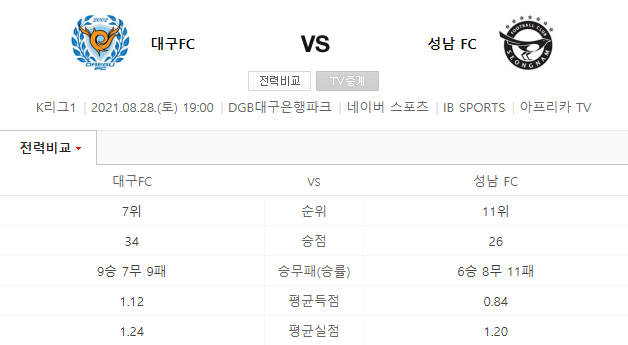 [킹콩티비] 대구FC 성남FC 분석 8월28일 K리그 스포츠중계