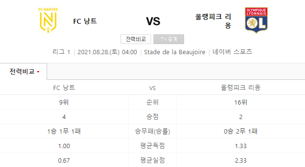[킹콩티비] 낭트 리옹 분석 8월28일 리그앙 스포츠중계