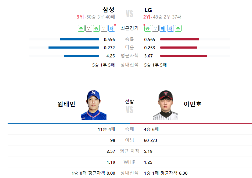 직전 삼성전에서 승리하며 그이전 무승부의 아쉬움을 달랜 LG는 이번경기 선발로 이민호