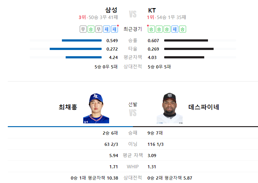 직전 LG와의 3차전에서 패하며 연패를 기록한 삼성은 이번경기 선발로 최채흥 선수가