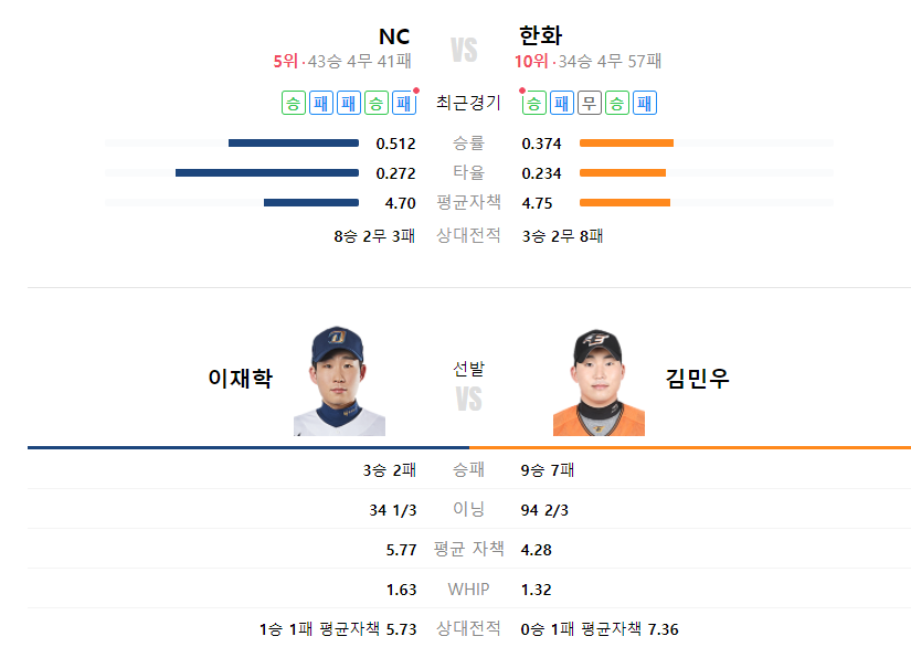 한화는 이번경기 선발로 김민우 선수가 등판한다. 이번시즌 18경기 등판해 94.2이닝 79