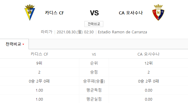 카디스는 현재 리그 9위에 위치하고 있으며 지난 경기에서 1:1로 무승부를 기록했다. 상대 전력과
