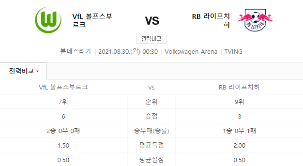 [킹콩티비] 볼프스부르크 라이프치히 분석 8월30일 분데스리가 스포츠중계