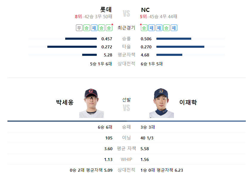 직전 한화와의 2차전에서 승리하며 연승을 기록한 롯데는 이번경기 선발로 박세웅 선