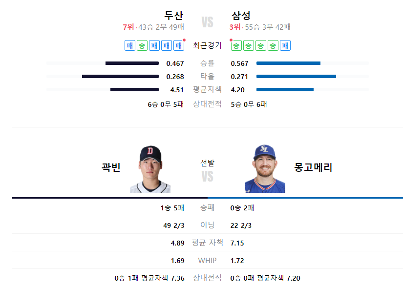 직전 SSG와의 2차전에서도 패하며 연패를 기록한 두산은 이번경기 선발로 곽빈 선수가