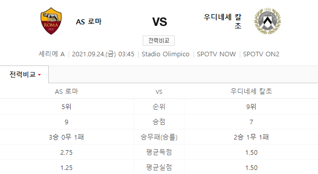 [킹콩티비] AS로마 우디네세 분석 9월24일 세리에A 스포츠중계