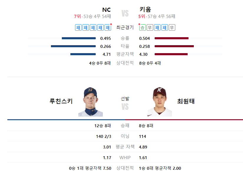 직전 키움전에서 패하며 5연패의 부진에 빠진 NC는 이번경기 선발로 루친스키 선수가 등판
