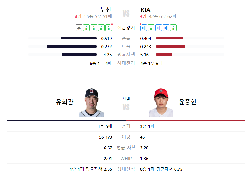직전 두산전에서 패하며 그 이전 KT전의 승리를 이어가지 못한 KIA는 이번경기 선발로 윤