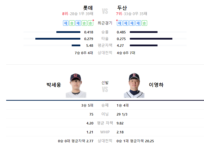 72피안타 50자책점 평균자책 8.23을 기록하는 부진한 성적을 보이고 있고 이번 상대 롯