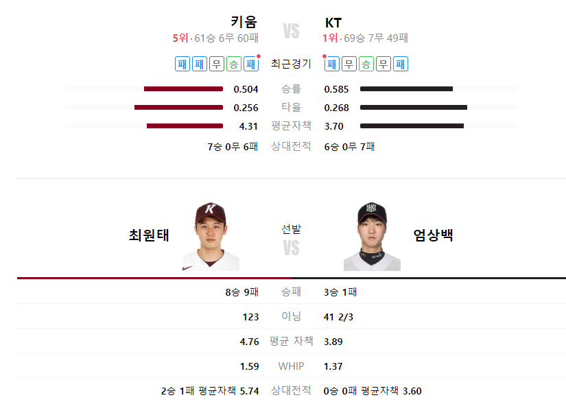 직전 삼성전에서 패하며 그 이전 승리를 이어가지 못한 키움은 이번경기 선발로 최원태 선수