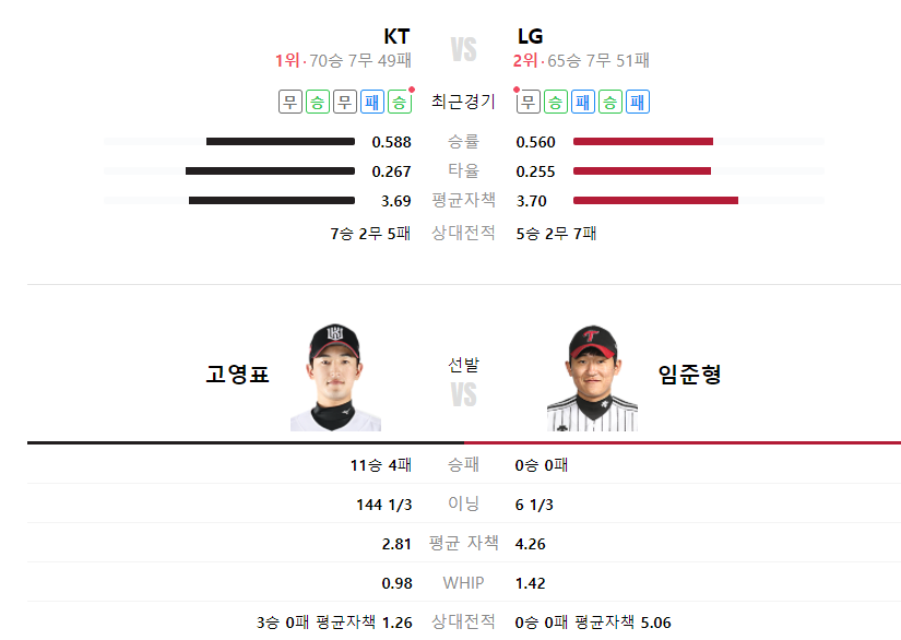직전 KIA전에서 아쉬운 무승부를 기록하며 연승을 이어가지는 못한 LG는 이번경기 선발