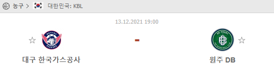 한국가스공사는 직전경기(12/11) 원정에서 창원 LG 상대로 82-83 패배를 기록했으며 이전경기(12/9) 원정에서 전주 KCC 상대로 103-98 승리를 기록했다. 최근 5경기 1승4패 흐름 속에 시즌 9승11패 성적. 창원 LG 상대로는 2경기 결장후 복귀한 득점기계 앤드류 니콜슨(39득점, 6리바운드)이 분전했지만 리바운드 싸움에서 밀리고 3점슛(22.2%, 6/27) 성공률이 떨어졌던 것이 전반전 10점차 리드를 지키지 못하고 역전패를 당하는 결정적인 패인이 되었던 경기. 4쿼터 승부처에 김낙현이 부상으로 가동될수 없었던 것도 문제가 되었고 마지막 공격에서 두경민의 실책성 플레이 때문에 시간에 쫒겨서 제대로 된 슛을 시도조차 못했던 상황. 또한, 상대전 3연패를 당하게 되었고 식스맨 싸움에서 밀렸던 패배의 내용.