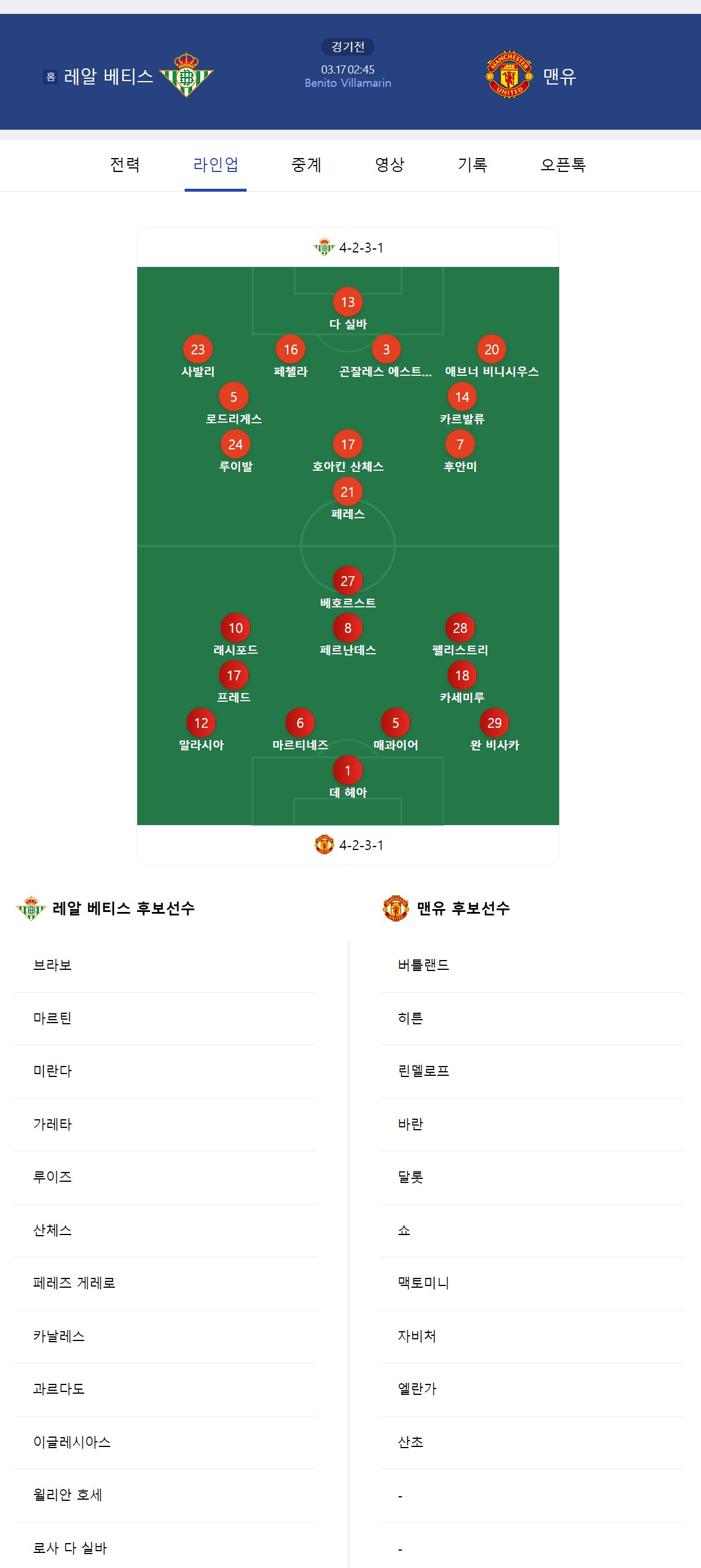 레알베티스 vs 맨유 라인업! 02:45