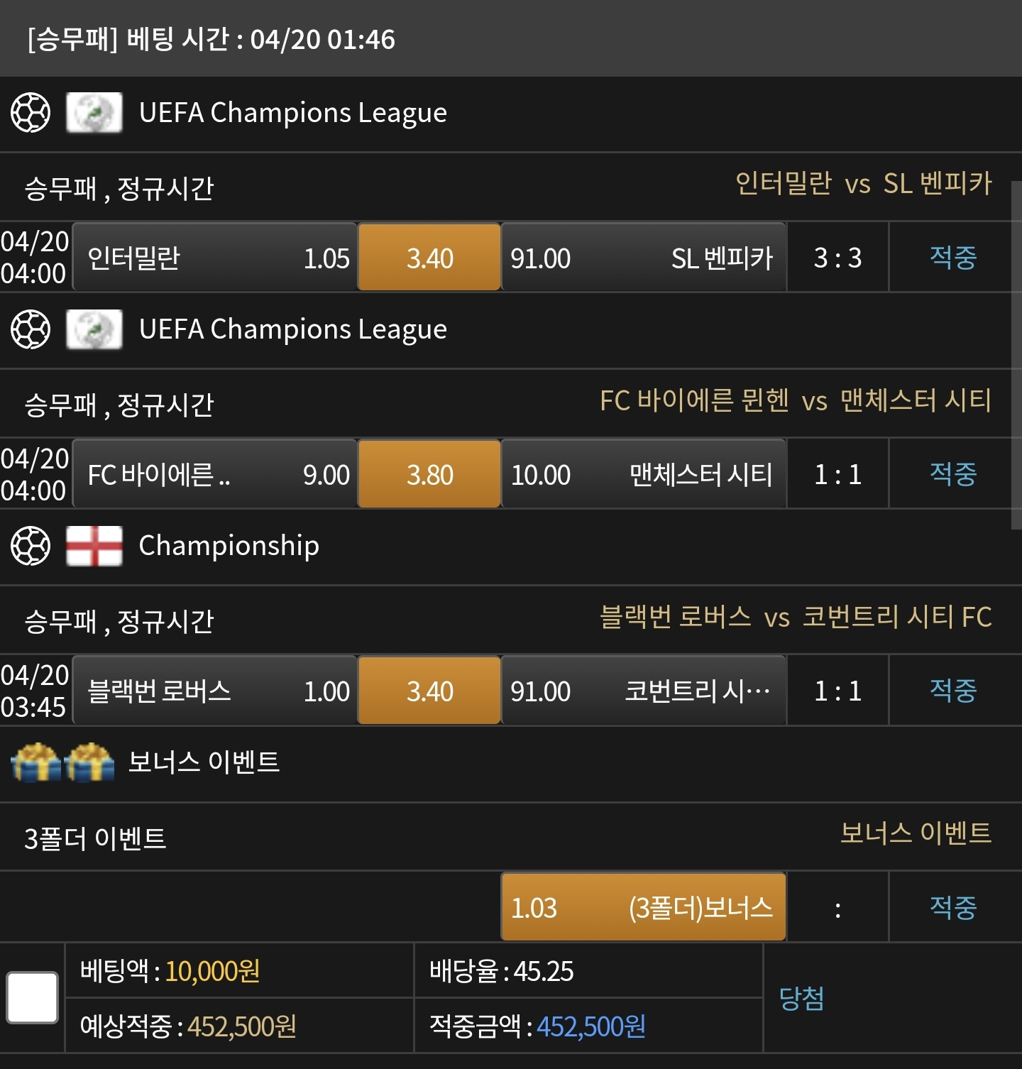 95분 극장골이 무려 두경기서 터지네요ㅋㅋㅋ특히 인터밀란 3대1인거 보고 바로 포기...블랙풀 94분 까지 1대0인거보고 바로 포기 근데 사이트들어가니 돈들어와있길래 보니 왠걸 95분대 극장골이 두경기서 터졌네요...소액이지만 이런게 진심 기분좋죠...샌프,콜로 강승부간거 찾네요...