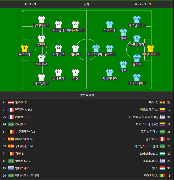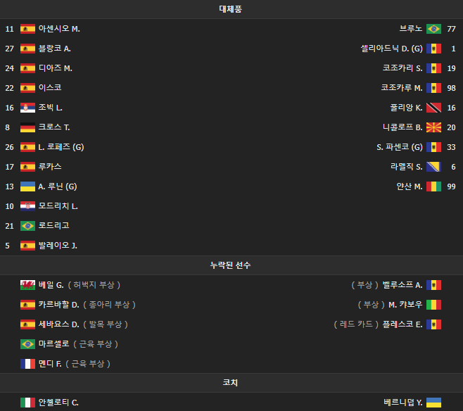 [레알 마드리드 vs 티라스폴 선발 명단]