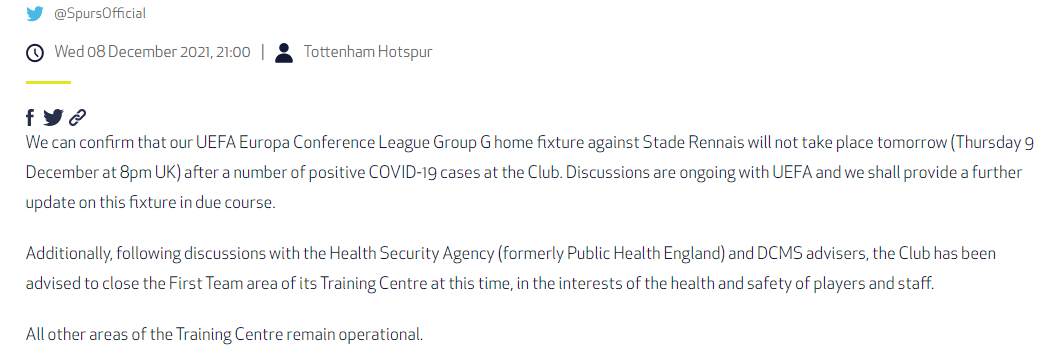 [토트넘 vs 렌 경기 취소]