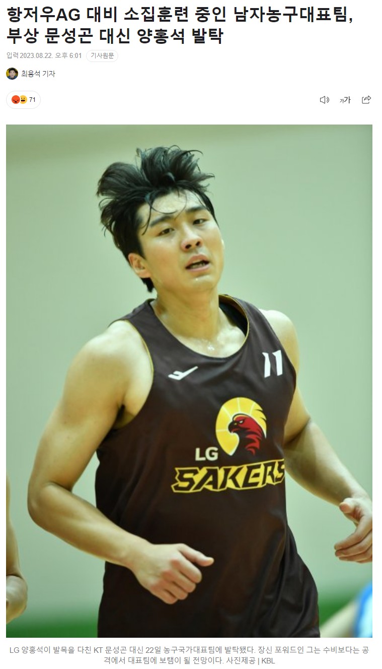 남자농구대표팀, 부상 문성곤 대신 양홍석 발탁