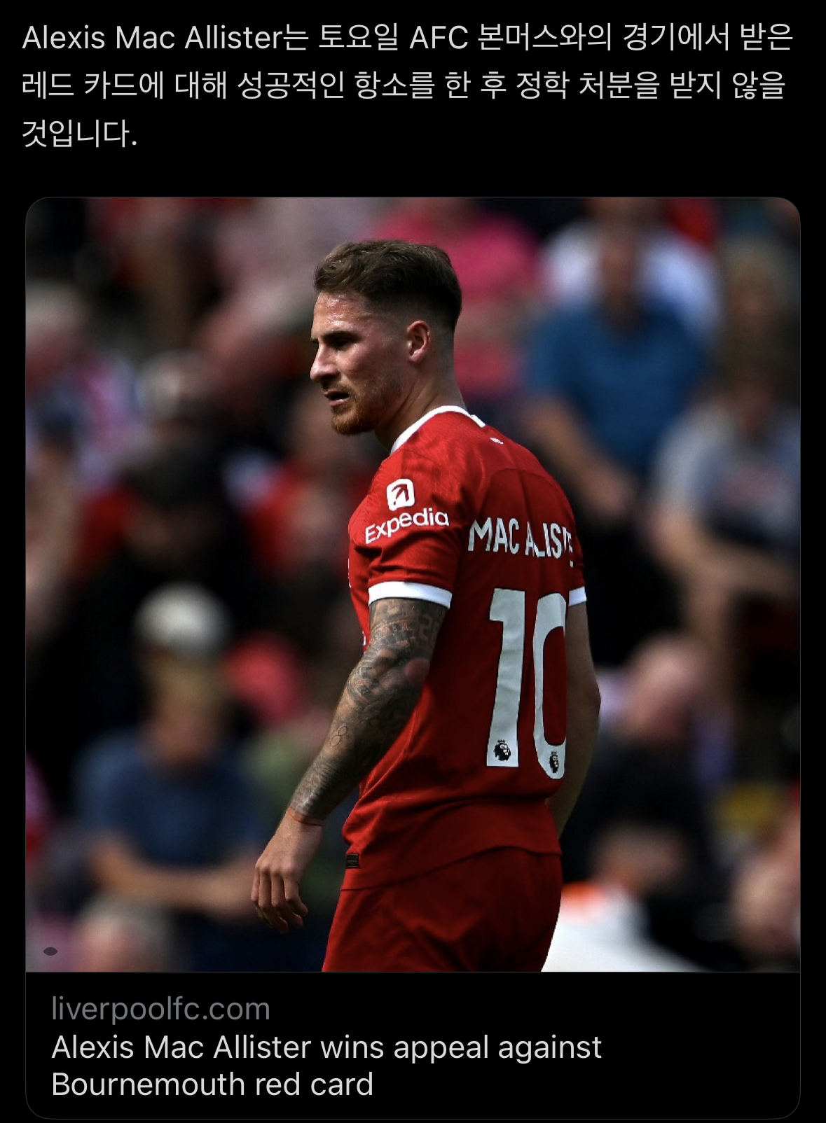 리버풀 항소 성공, 맥알리스터 징계 취소
