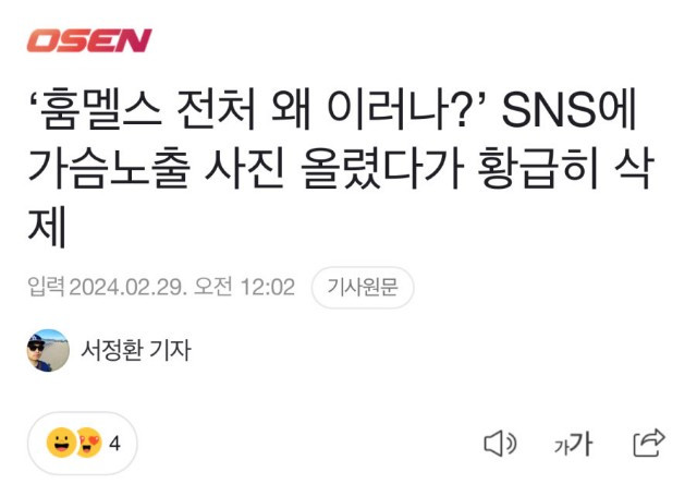 SNS에 가슴 노출 사진 올렸다 황급히 삭제